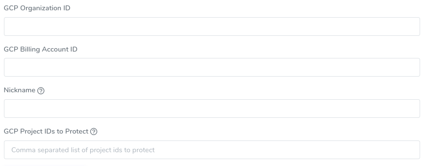 * GCP Project IDs to Protect: projects **within the organization** that you would like to protect.