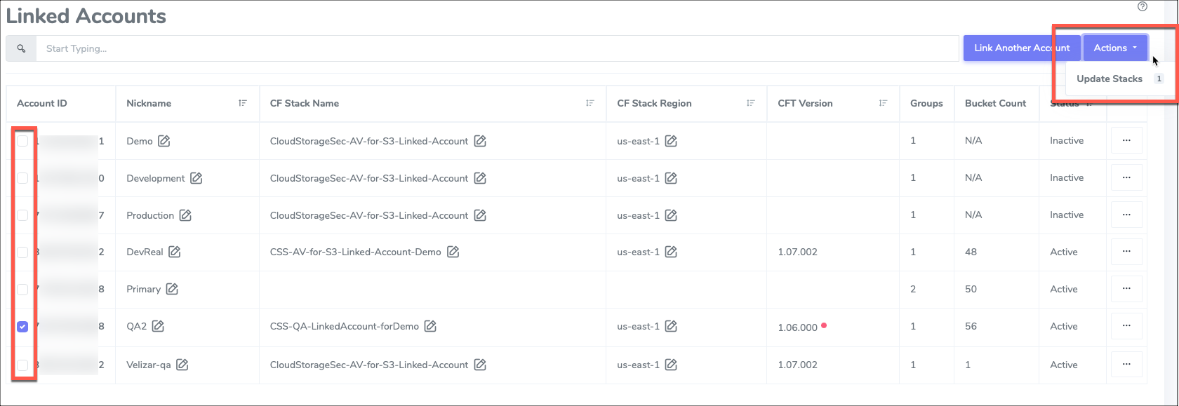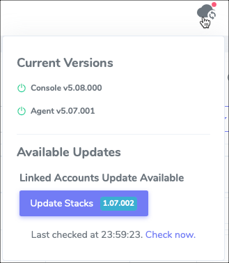 Simplified Linked Account Role management was introduced starting with Console version 5.08.000 and Linked Account Role version 1.06.000. With both of those versions (or greater) in place, you can simply upgrade a single account, multiple accounts or all accounts to the latest Linked Account Role. This removes the need to go to each and every linked account to do a Stack Update on the CloudFormation stack that initially created the role.