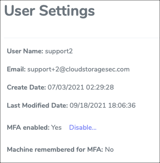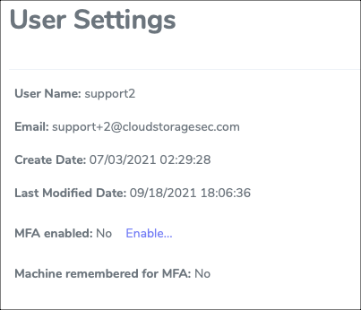 <figure><img src="https://905555942-files.gitbook.io/~/files/v0/b/gitbook-x-prod.appspot.com/o/spaces%2FlGcQw8I2CHyi1loKBlfi%2Fuploads%2FVDGmtTkhLGRxM0QMGmal%2Fmfa-user-settings-enabled.png?alt=media" alt=""><figcaption></figcaption></figure>