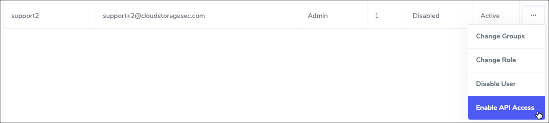 To enable a user for API access you select the Actions menu for the user and select `Enable API Access`<br>