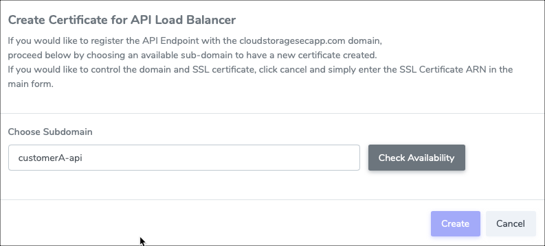 The `SSL Certificate ARN` is the SSL certificate to associate with the load balancer. You will typically create the certificate to match a friendly URL. If the certificate and API URL do not match, you will get certificate validation warnings and errors. You can code around those, but better to match them up. With the `SSL Certificate ARN` you have a choice to create your own or leverage ours like the Management Console. The default behavior of the Management Console is to give you persistent access through the `cloudstoragesecapp.com` domain. We also offer this option for the API Endpoint(s). This allows for a very fast and simple setup for the API Endpoint and doesn't require you to provide your own cert and friendly DNS entry. Your environment could look like the following: console = `customerA.cloudstoragesecapp.com` and your API endpoint = `customerA-api.cloudstoragesecapp.com`. And we'll do it all for you.