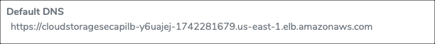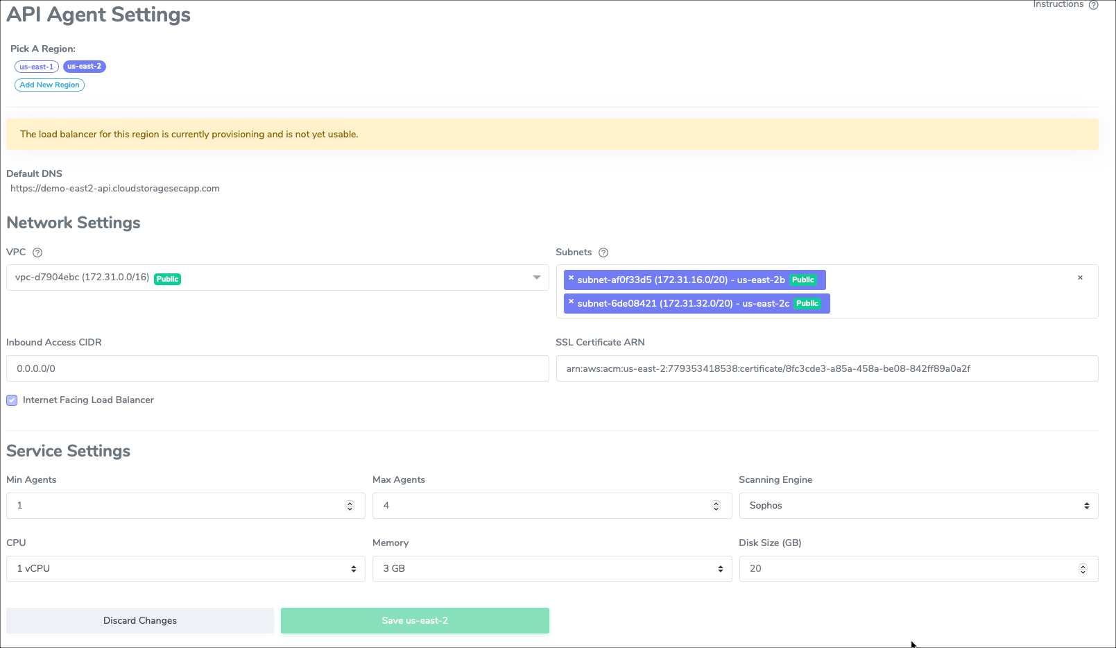 This will not show on the page as you are setting up a new service region. Once the setup is complete and the load balancer has been created, this page will show the default DNS value. This is the value assigned to the load balancer, not necessarily the value you plan to use with your application teams. This URL is a fully valid and working address, so you can submit API scans to this. It is recommended that you create a CNAME record in your DNS that links a friendlier name to this LB url. This is to ensure validity of the SSL certificate being used. While it still works to simply use the LB url, you would need to disable SSL certificate verification in order to access it.