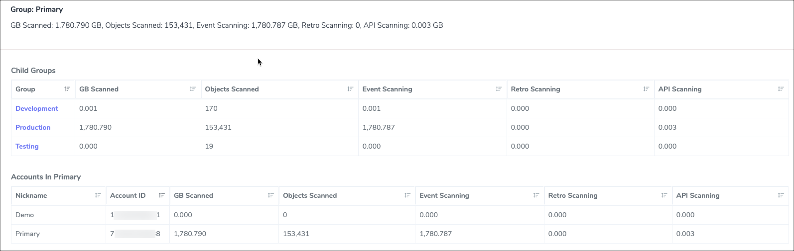 The `Usage` page is a rollup view of each/all Groups and each/all Accounts by time slice (month to date, previous month, 3/6/12 months). Charts at the top of this page will show you a rolling 12 month view the total GBs scanned based on which Group you have selected. The panels below the charts will give you greater detail into the overall GBs scanned broken down by `scan type` (Event, Retro or API) for each and every group. If you do not use groups at all, then you will see all of your accounts listed both in the charts as well as the panels.