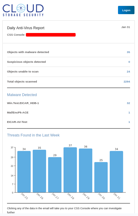 For customers who want a daily summary of Anti-Virus scanning sent to their inboxes, we offer the ability to send daily email reports detailing recently found threats. We show a brief report including types of problem files found, malware detected, and threats found in the last week.