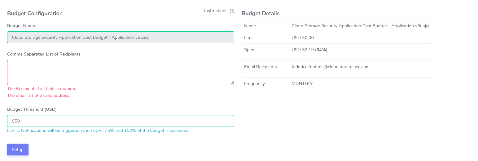 Set up the Budget Configuration with your budget name, email list, and threshold. We'll notify you when each threshold is met.