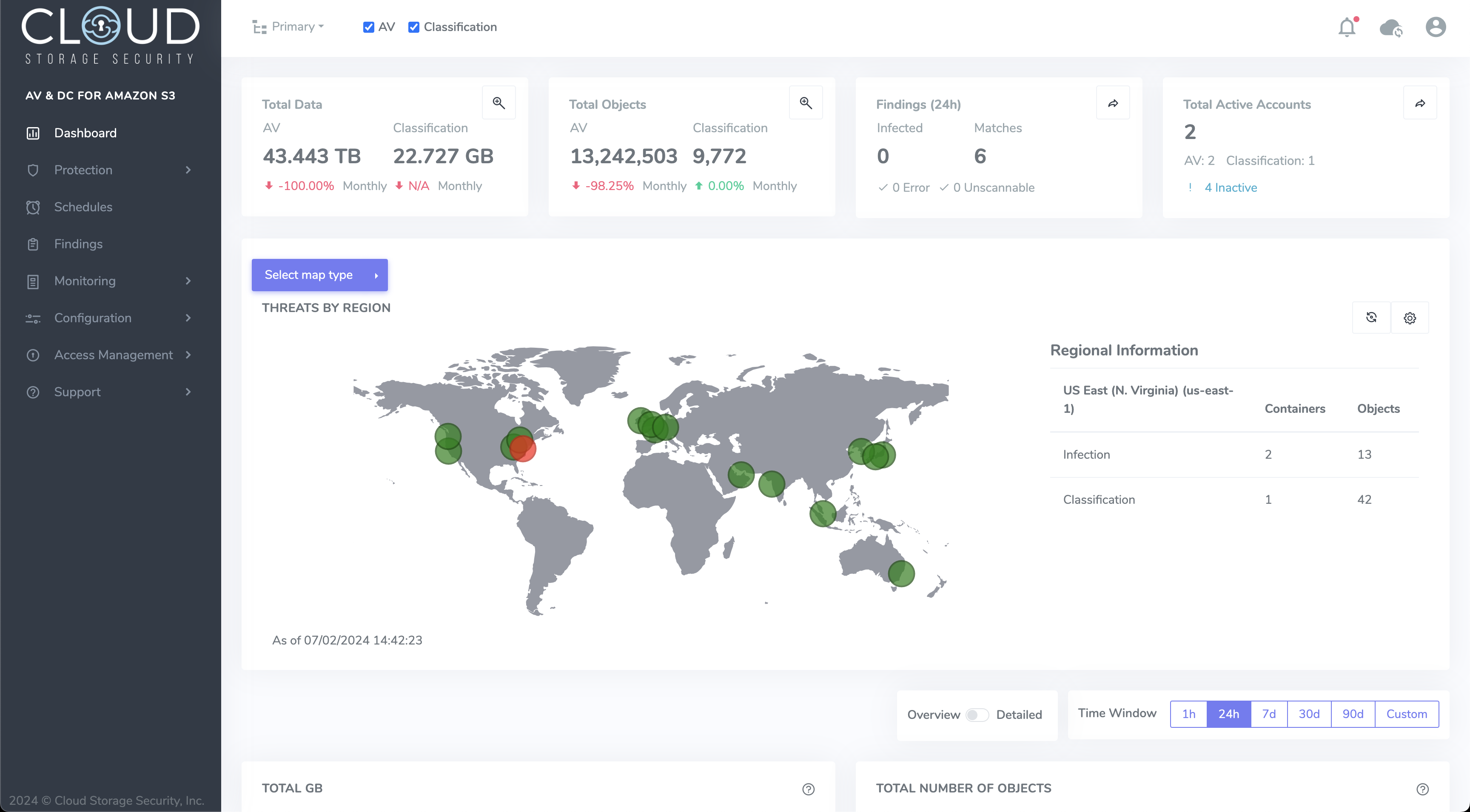 * The Dashboard has a world threat map which shows the regions you have S3 buckets in and surfaces any infections/classification matches in those regions